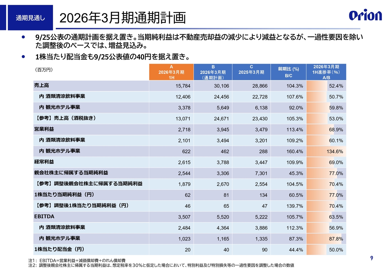 営業利益は前期比約113パーセント、前期比EBITDAは前期比105.7パーセントであり、9月25日に公表した通期計画を据え置いています。当期純利益については、不動産売却益の減少により減益となりますが、一過性の要因を除いた調整後のベースでは増益となる見込みです。
