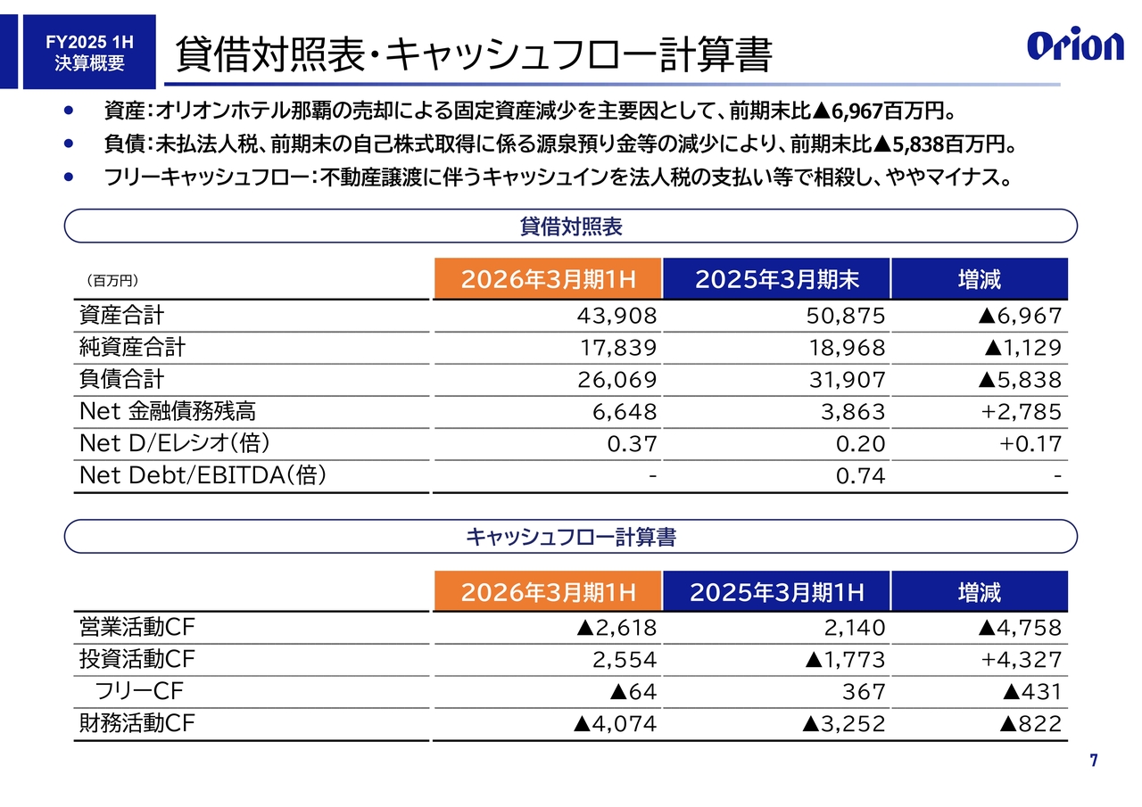 また、投資キャッシュフローは「オリオンホテル那覇」の譲渡により約43億円増加しました。結果として、フリーキャッシュフローは前年より4億円ほど微減しています。以上が決算の概要説明です。