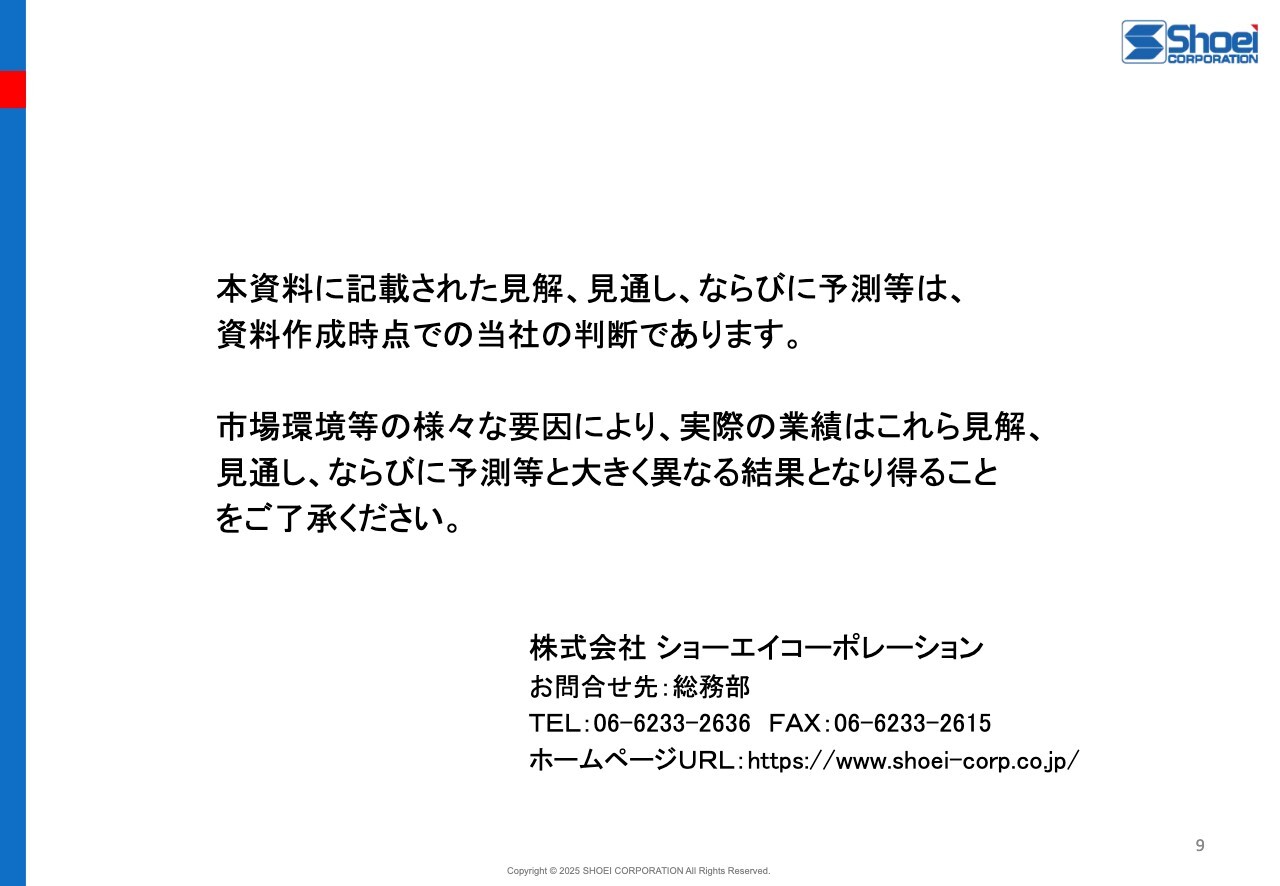 本資料に記載された見解や見通しは、現時点での判断によるものであり、実際の業績はさまざまな要因により異なる場合があります。お問い合わせは総務部までお願いします。