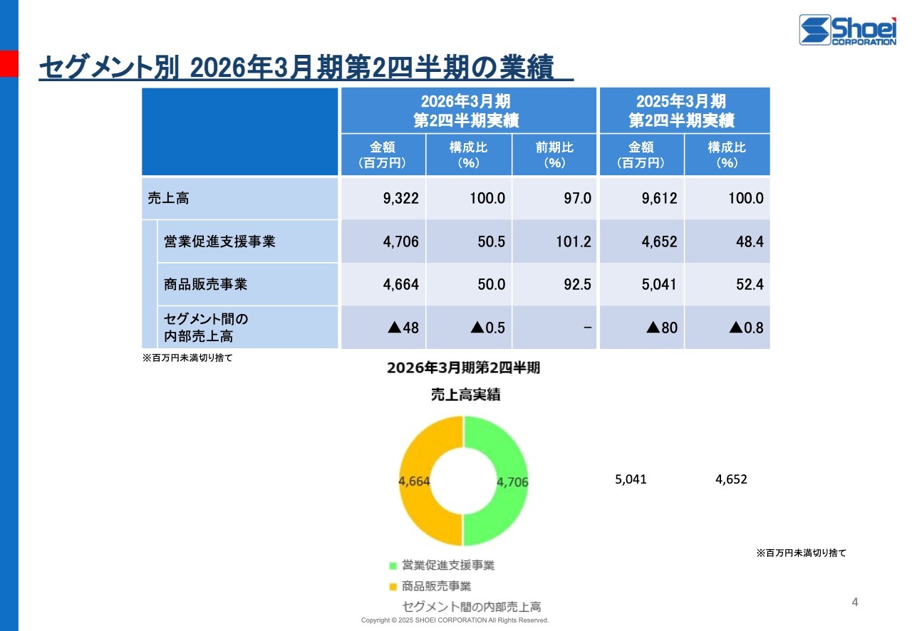 芝原英司氏:代表取締役社長の芝原です。2026年3月期第2四半期の業績概要、セグメント別の状況についてご説明します。