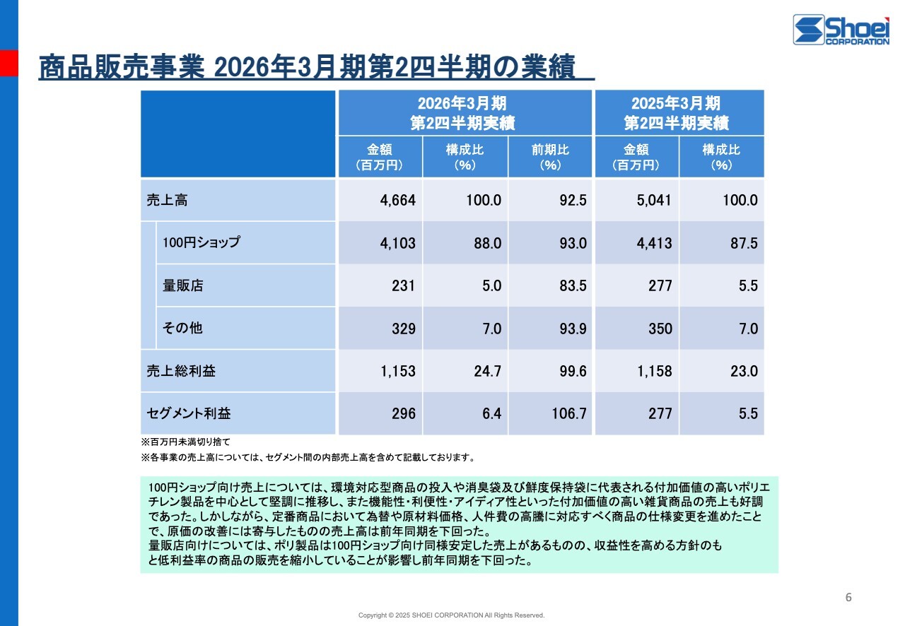 量販店向けについては、ポリエチレン製品は100円ショップ向け同様安定した売上があるものの、収益性を高める方針のもと低利益率の商品の販売を縮小したことが影響し、前年同期と比べて4,600万円減少(前年同期比16.5パーセント減)の、23億1,000万円となりました。