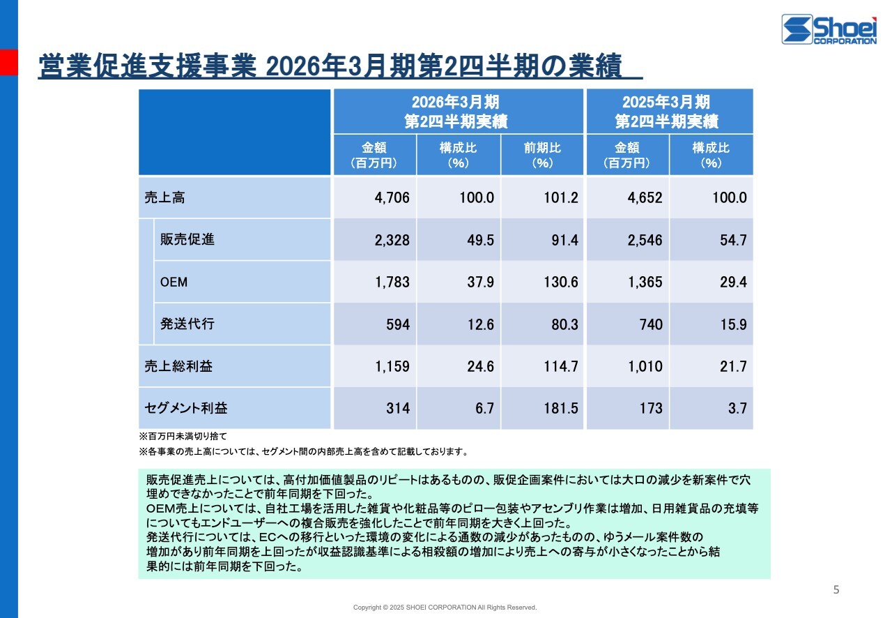 OEM売上については、自社工場を活用した雑貨や化粧品等のピロー包装やアセンブリ作業は増加、日用雑貨品の充填等についてもエンドユーザーへの複合販売を強化したことで前年同期に比べて4億1,800万円増加(前年同期比30.6パーセント増)の、17億8,300万円となりました。