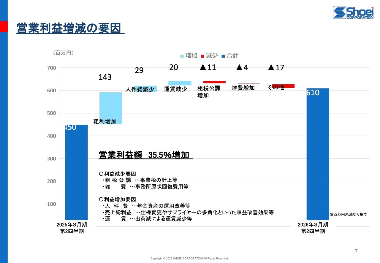 営業利益増減要因としては、表に記載のとおりです。営業利益は、前年同期比で35.5パーセント増加し、6億1,000万円となりました。大幅に改善した背景には、コスト削減と収益性向上の両面での取り組みが寄与しています。