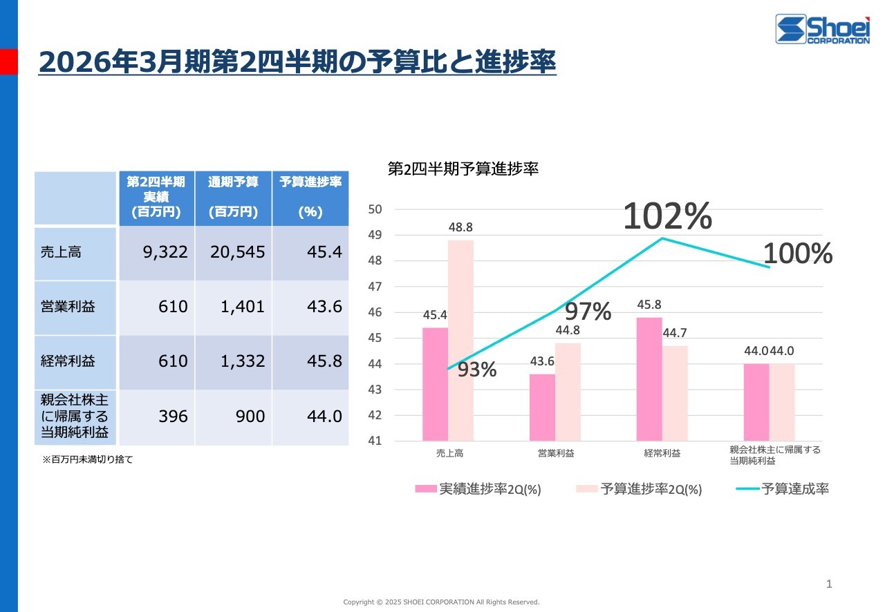 第2四半期予算に対しての達成状況は、売上で93パーセント、営業利益で97パーセント、経常利益で102パーセント、純利益で100パーセントと各項目とも順調に推移しています。