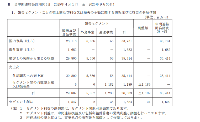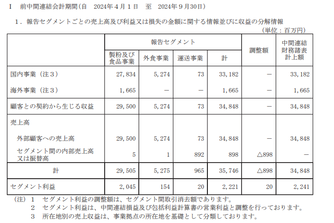 製粉及び食品事業の売上高は295億500万円、セグメント利益は20億4,500万円でした。外食事業の売上高は52億7,500万円、セグメント利益は1億5,400万円でした。運送事業の売上高は9億6,500万円、セグメント利益は2,000万円となりました。