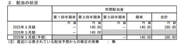 2026年3月期の第2四半期末配当金は140円00銭としました。2026年3月期の年間配当予想は280円00銭であり、直近日に公表された配当予想からの修正はございません。