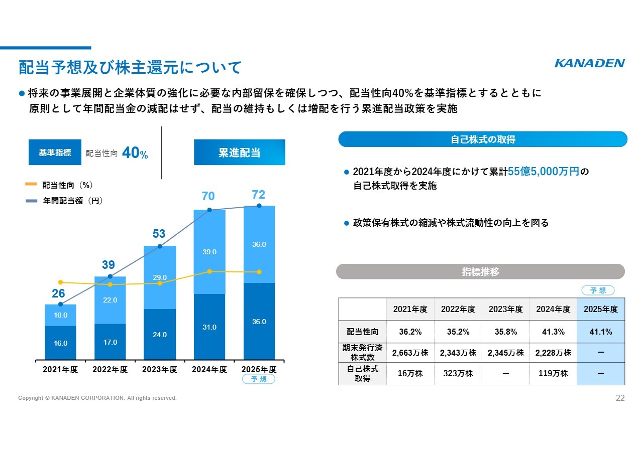 配当予想については、今期から配当方針を見直し、原則として年間配当金の減配はせず、配当の維持もしくは増配を行う累進配当政策を実施しています。今期の年間配当は、前期比2円増配の72円を予想しています。