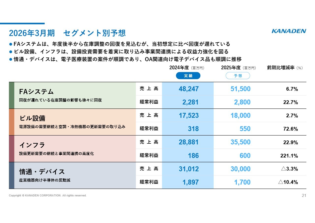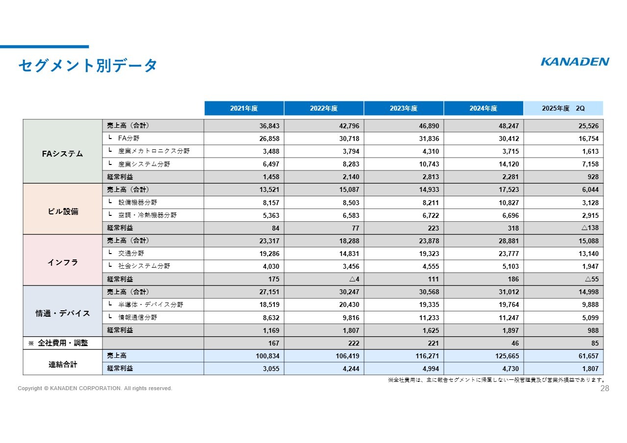 トータルの業績予想に関しては、5月に公表した予想数値から変更はありませんが、セグメント別の予想数値については修正を行っています。