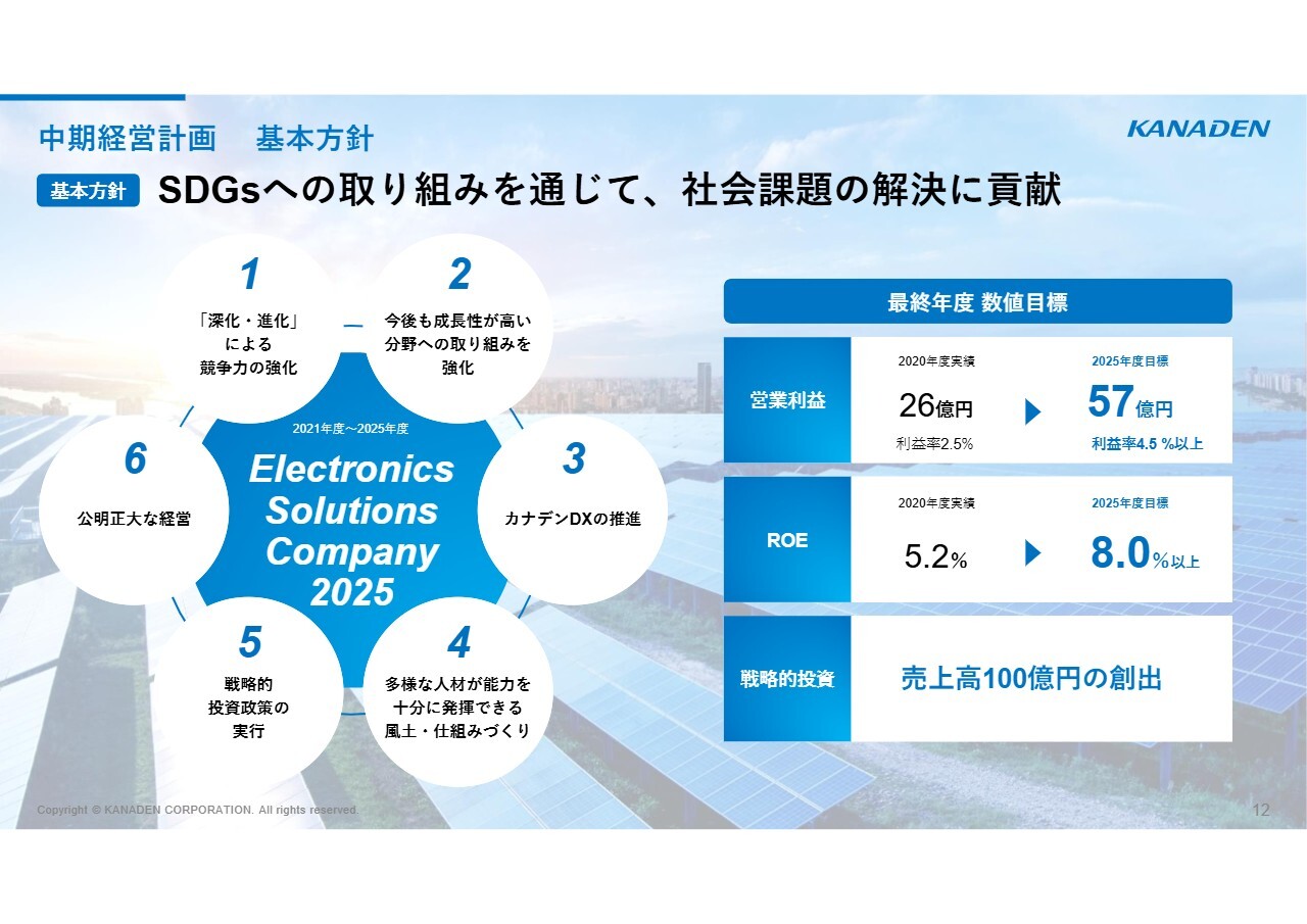 続いて、5ヶ年中期経営計画「ES・C2025」についてご説明します。2021年度から取り組んでいる中期経営計画では、「SDGsへの取り組みを通じて社会課題の解決に貢献し、持続的な成長を実現するエレクトロニクスソリューションズ・カンパニーとなる」を基本方針としています。