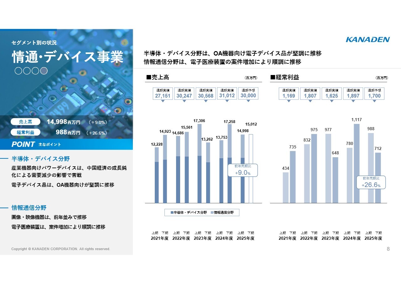 情通・デバイス事業については、半導体・デバイス分野で産業機器向けパワーデバイスの在庫積み増しの反動減により苦戦が予想されましたが、上期はOA機器向け電子デバイスの増加など順調に推移したため、通期予想を上方修正しました。