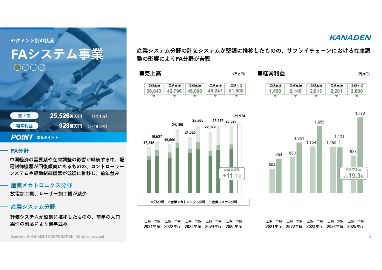 セグメント別の状況についてご説明します。はじめにFAシステム事業です。FA分野では、中国経済の成長鈍化による需要減少や在庫調整の影響を受け、コントローラーシステムや駆動制御機器を中心に低調な推移となりましたが、データセンター向けの配電制御機器は回復傾向で推移しました。