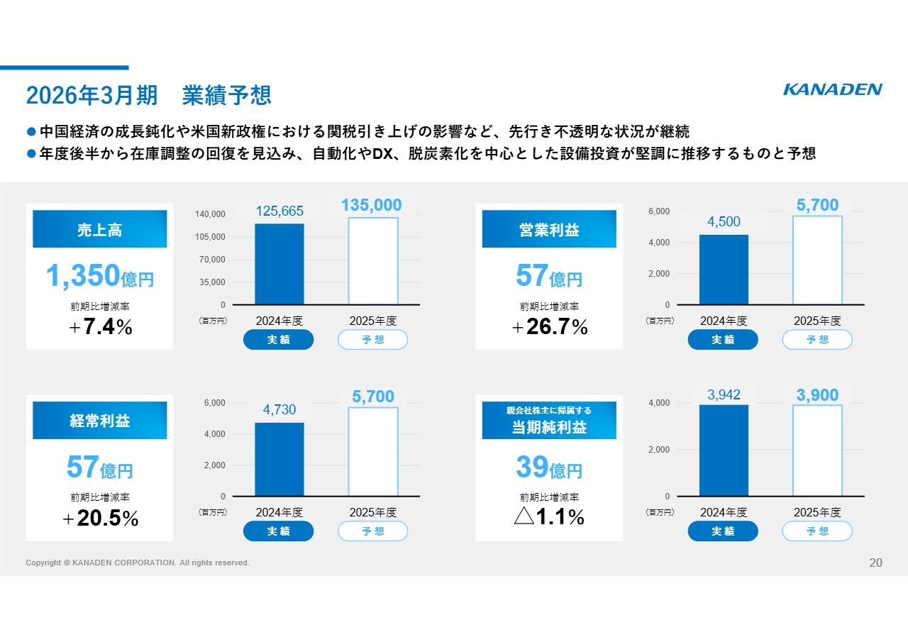 2025年度通期業績予想は、売上高は前期比7.4パーセント増の1,350億円、営業利益は前期比26.7パーセント増の57億円、経常利益は前期比20.5パーセント増の57億円と見込んでいます。当期純利益については、2024年度に特別利益11億2,300万円を計上したことから、前年並みの39億円を予想しています。