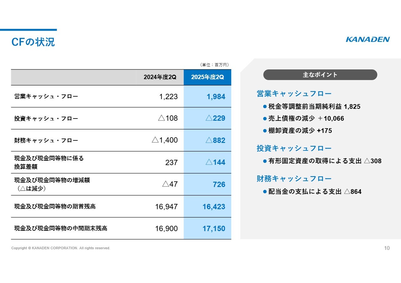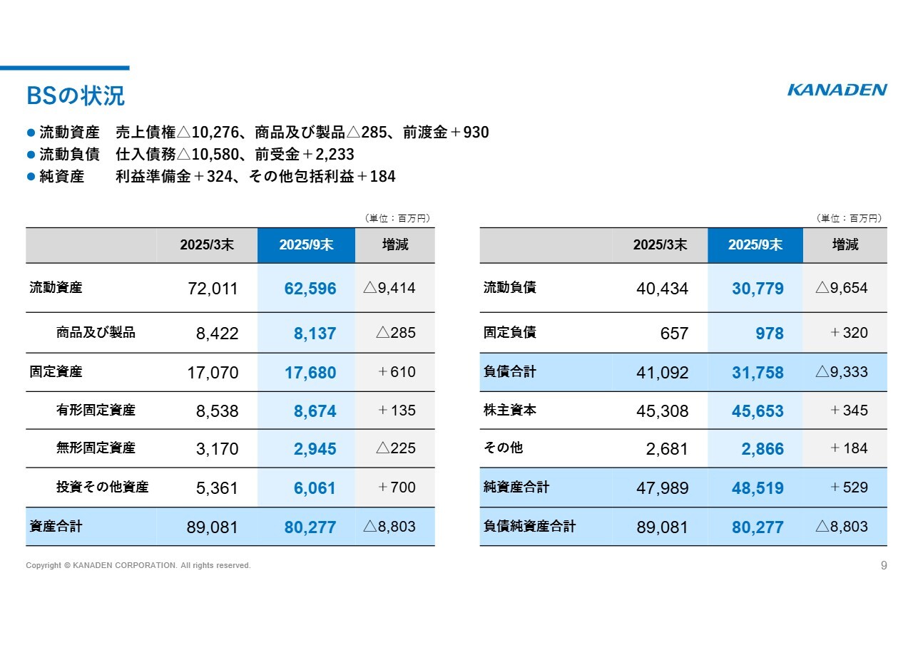 バランスシートの状況についてご説明します。当社グループは、ビル設備およびインフラ事業において、検収時期が年度末に集中し、業績が下半期に偏る傾向があります。これに伴い、売上債権や仕入債務が増加する3月末に比べ、期中は総資産や負債が減少する傾向にあります。