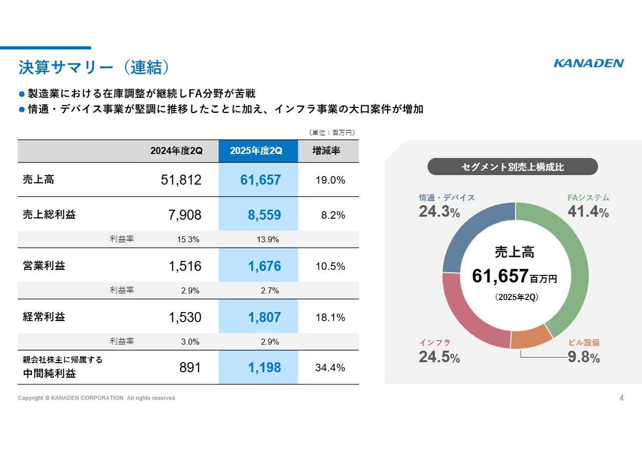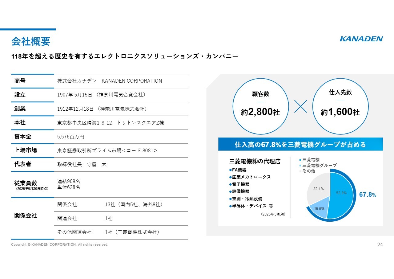 守屋太氏:株式会社カナデン代表取締役の守屋です。本日はお忙しい中、当社の決算説明会にご参加いただき誠にありがとうございます。当中間期の決算概要についてご説明します。