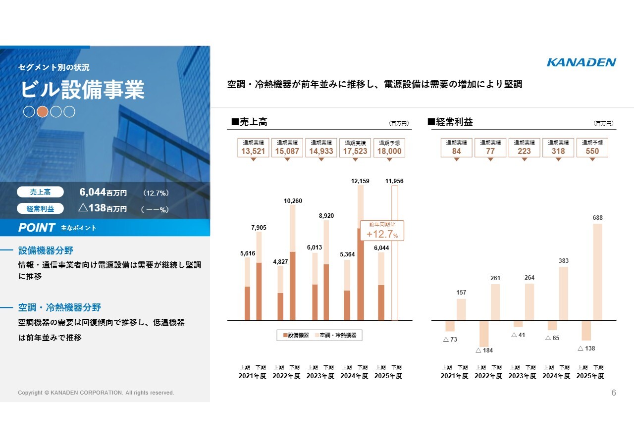 ビル設備事業です。設備機器分野では、情報・通信事業者のデータセンター向け電源設備の需要が継続し、堅調に推移しました。空調・冷熱機器分野では、猛暑の影響もあり空調機器の需要が回復傾向にある一方、低温機器は前年並みで推移しました。