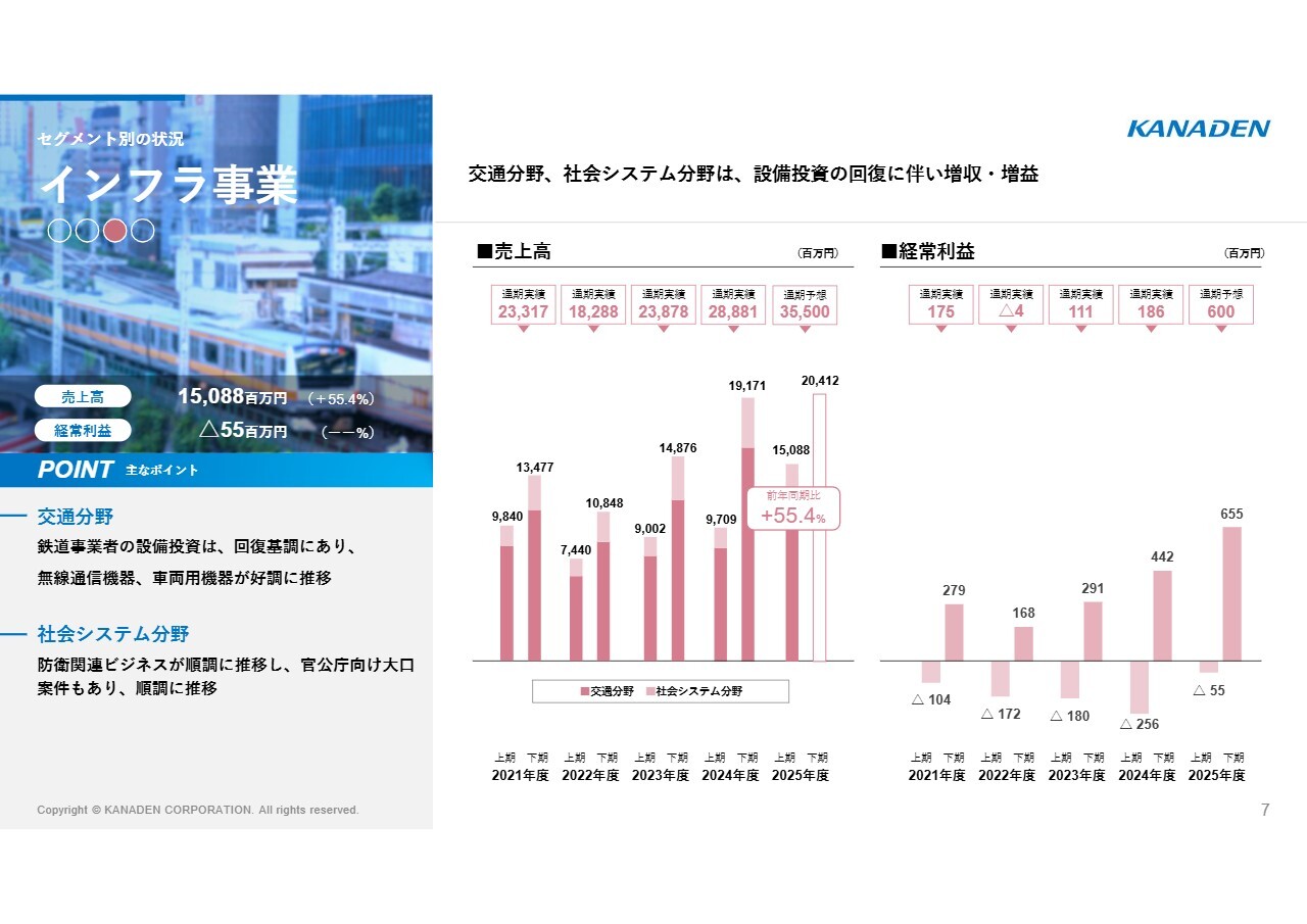 インフラ事業については、鉄道事業者の設備投資が順調に推移しているほか、防衛関連を含む官公庁案件も順調に進捗していることから、売上高・利益ともに当初予想を上方修正しました。