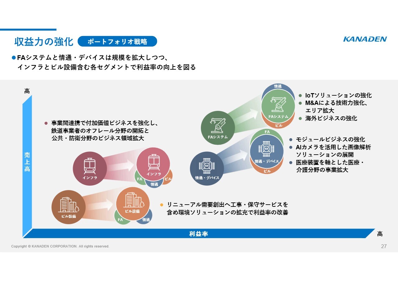 当社のポートフォリオ戦略は、比較的収益性の高いFAシステムと情通・デバイスで規模拡大を図り、収益性の低いインフラとビル設備で利益率改善を目指す2軸の構造となっています。