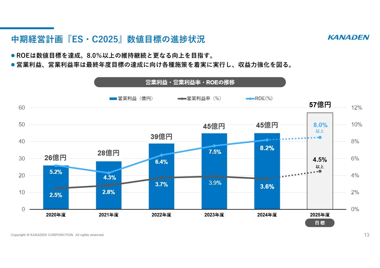 基本戦略については、持続的成長に向けた収益構造の強化を意識し、スライドに記載する6項目に継続して取り組んでいます。2025年度の数値目標として「営業利益57億円」「営業利益率4.5パーセント以上」「ROE8パーセント以上」「戦略的投資による売上高100億円の創出」を掲げ、目標達成を目指しています。