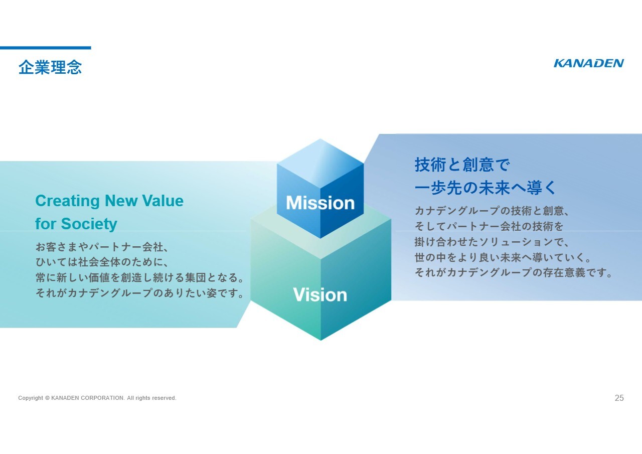 当社は、ミッションとして「技術と創意で一歩先の未来へ導く」、ビジョンとして「Creating New Value for Society」を掲げています。