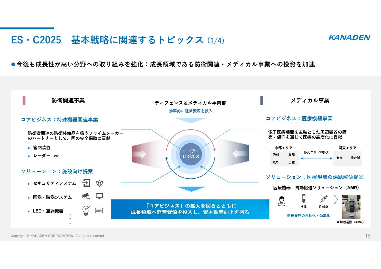 昨今の防衛意識の高まりや医療・介護需要の拡大を受け、両事業の成長性はますます高まっています。今後もコアビジネスの拡大を図るとともに、成長領域へ経営資源を集中的に投入することで事業ポートフォリオ戦略を進展させ、資本効率を高めていきます。