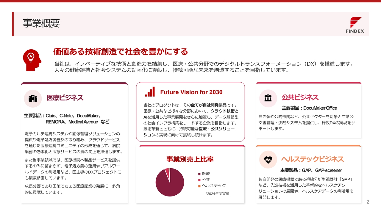 事業概要です。当社は「価値ある技術創造で社会を豊かにする」を経営理念に掲げ、医療分野および公共分野のデジタルトランスフォーメーション(DX)を推進しています。イノベーティブな技術と創造力を結集し、人々の健康の維持と社会システムの効率化に貢献することで、持続可能な未来を創造することを目指しています。