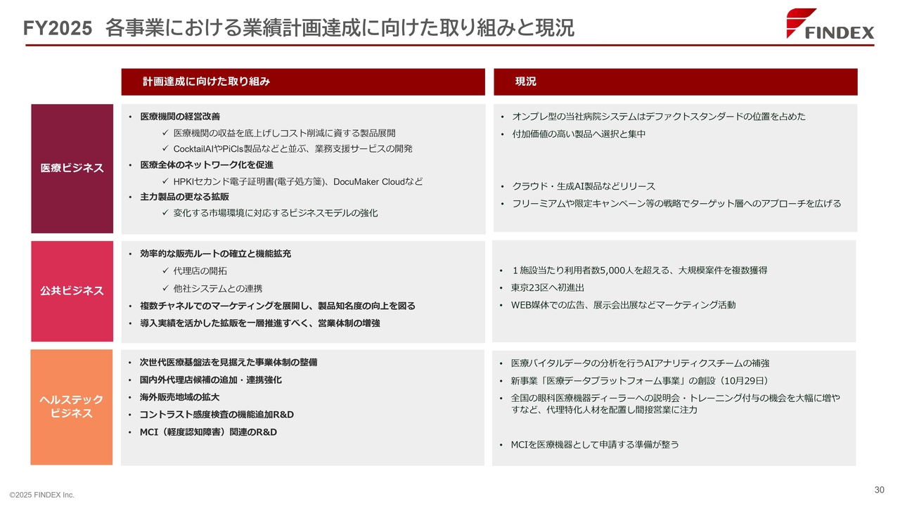 FY2025 各事業における業績計画達成に向けた取り組みと現況