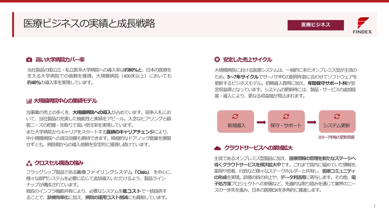ビジネスモデルについては、安定した売上サイクルであることが特徴です。大規模病院の医療システムは、一般的にオンプレミス型が主流であり、ハードウェアの耐用年数に合わせて、ソフトウェアも5年から7年単位で更新されます。