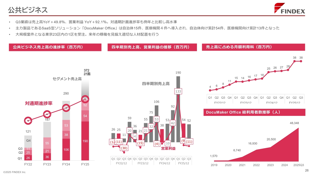 セグメント別では、公共ビジネスの成長が顕著です。公共ビジネスの第3四半期累計の売上高は前年同期比49.8パーセント増の2億9,500万円、営業利益は前年同期比92.1パーセント増の1億1,300万円と大きく伸長しています。