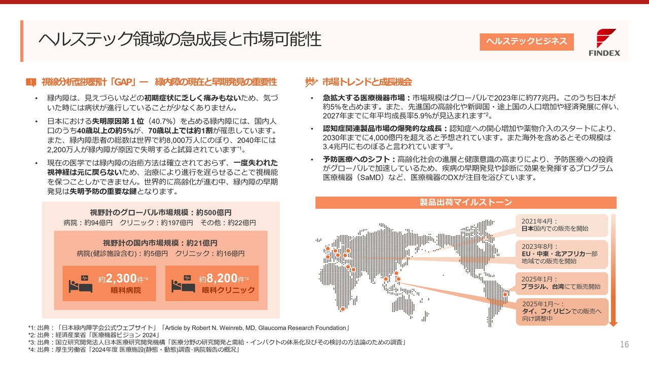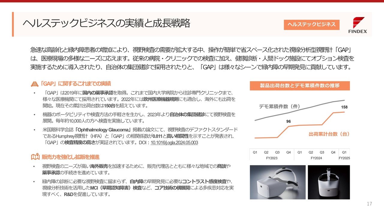 当社が開発した世界で唯一、視線解析技術を応用した医療機器「GAP」は、すでに国内の眼科診療所や病院で導入が進んでおり、海外でもEU、台湾、南米などで販売を開始し、グローバル展開の初期フェーズに入っています。
