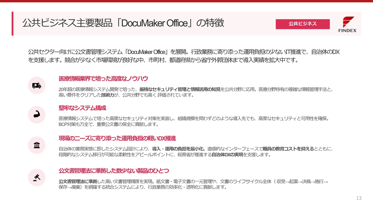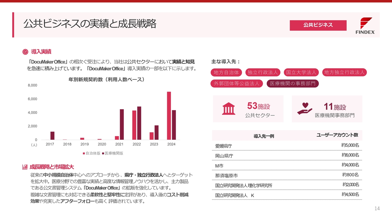 公共ビジネスの取り組みとしては、効率的な販売ルートの確立と製品機能の拡充を進めています。具体的には、新たな代理店の開拓や、他社システムとの連携を強化し、複数チャネルでのマーケティングを展開することで、製品の知名度向上を図っています。また、導入実績を活かした拡販を一層推進するために、営業体制の増強を進めています。