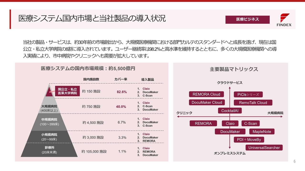 スライド左側には医療システムの国内市場規模を規模別に記載しています。約5,500億円と莫大な市場規模の中で、当社は主に大規模病院を中心に存在感を高めると同時に、ユーザー継続率は98.2パーセントと高い水準を維持しています。