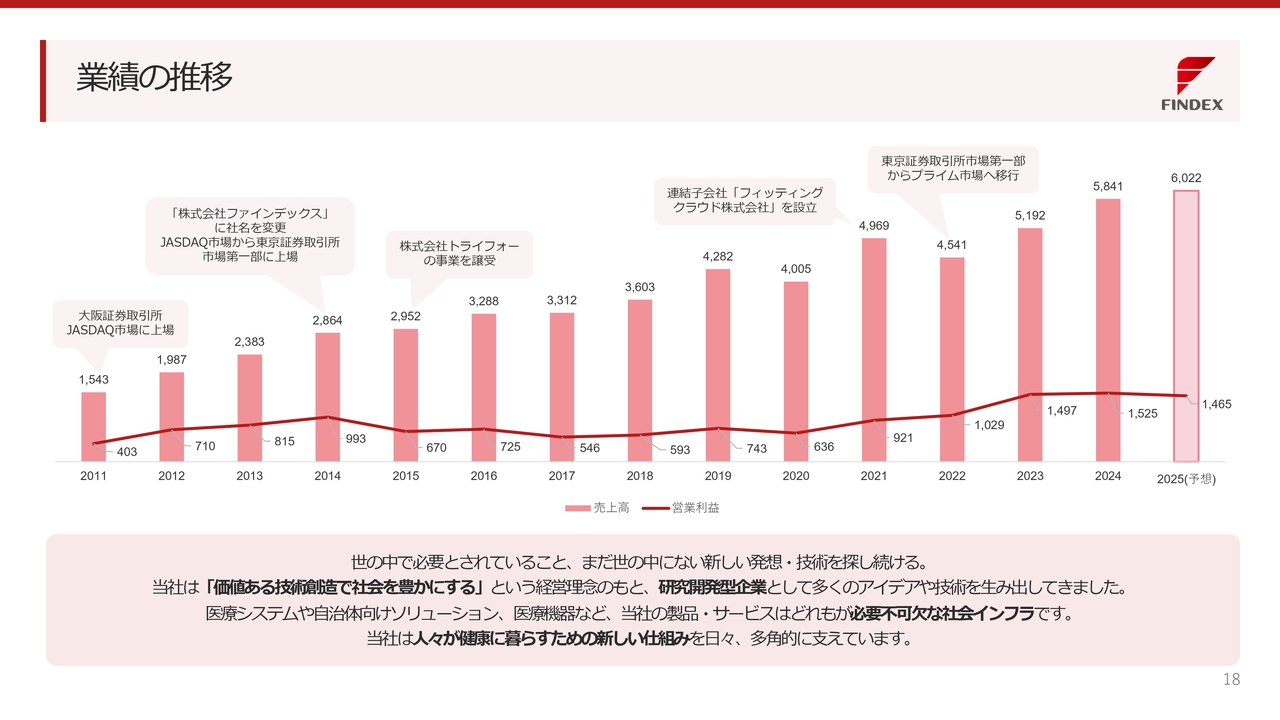 売上高は2011年度の大阪証券取引所、JASDAQ市場上場時の15億4,300万円から、社名変更の上東京証券取引所第一部に上場した2014年度には28億6,400万円へ拡大しました。2015年度にはトライフォーの事業を譲受、その後もほぼ一貫して増加傾向を維持してきました。