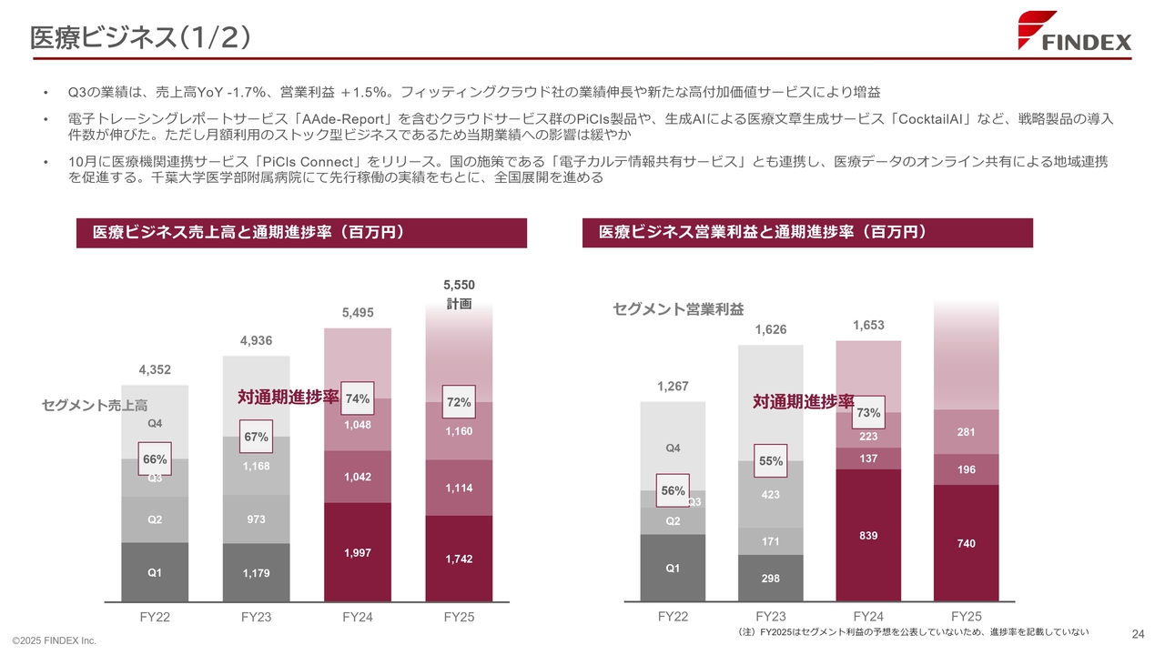 電子トレーシングレポートサービス「AAdE-Report」を含むクラウドサービス群「PiCls」製品や、生成AIによる医療文章生成サービス「CocktailAI」といった戦略製品の導入が拡大しています。ただし、これらは月額利用のストック型ビジネスであるため、当期の売上への寄与は限定的です。