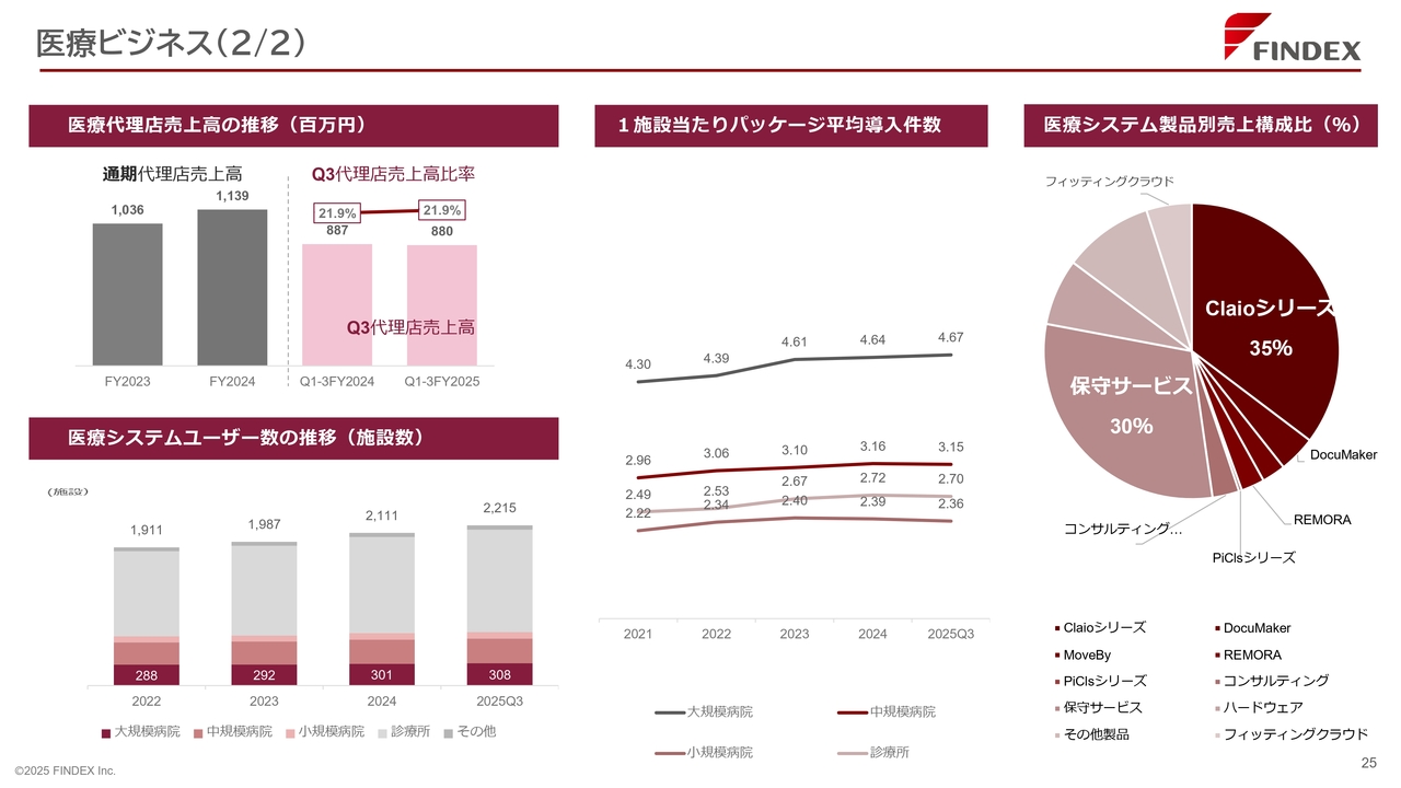 左下は、医療システムユーザー数の推移です。第3四半期累計の医療システムユーザー数は2,215施設となり、順調に上昇しています。
