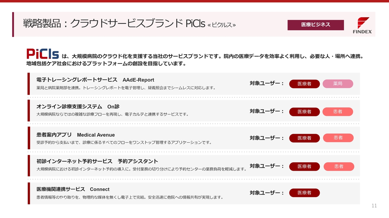 まずは医療ビジネスです。取り組みとして医療機関の経営改善を掲げ、医療機関の収益を底上げし、コスト削減に資する製品群を展開するとともに、「CocktailAI」「PiCls」製品に並ぶ新たな業務支援サービスの開発を進めています。