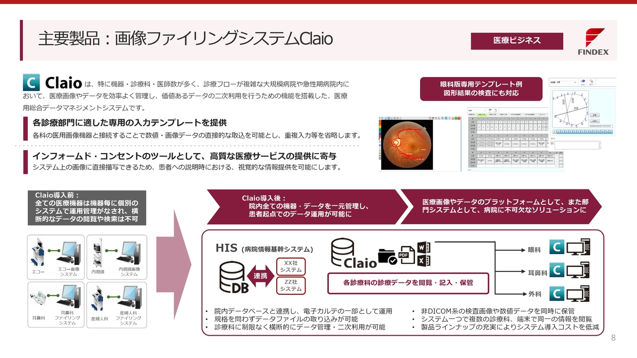 クロスセル構造においても強みを持っています。当社のフラッグシップ製品である画像ファイリングシステム「Claio」を核として、その上にさまざまな部門システムを追加導入できるよう、製品ラインナップを設計しています。