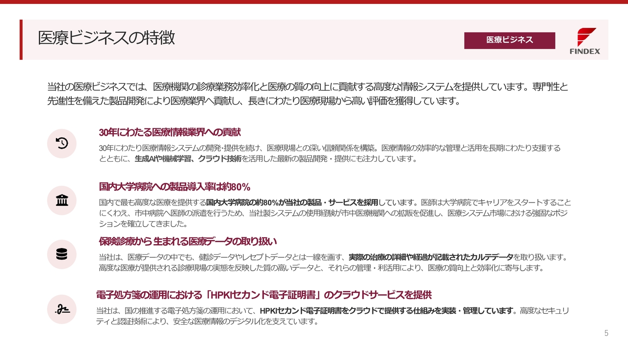 医療ビジネスには4つの特徴があります。1つ目は、30年にわたる医療情報業界への貢献です。当社は約30年間にわたり医療情報システムの開発・提供を続けており、医療現場との深い信頼関係を築いてきました。医療情報の効率的な管理と活用を長期にわたって支援するとともに、生成AIや機械学習、クラウド技術を活用した最新の製品開発にも積極的に取り組んでいます。