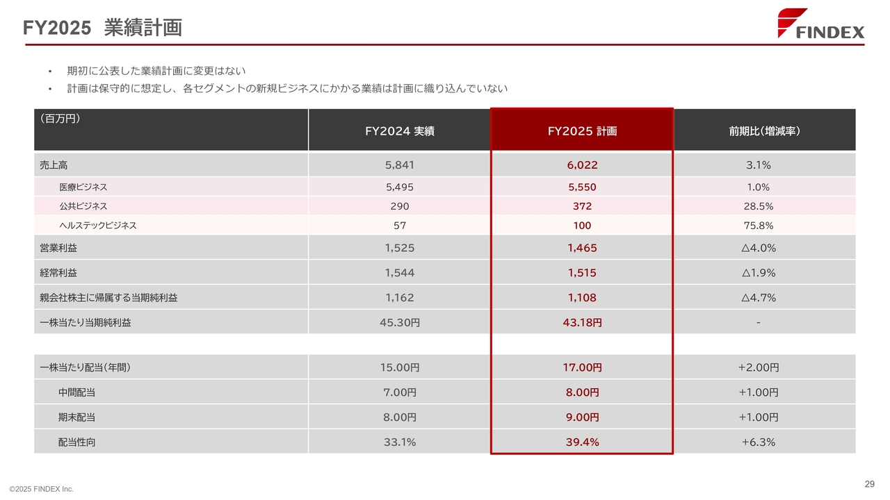 売上高は前期の58億4,100万円から3.1パーセント増の60億2,200万円を見込んでいます。セグメント別では、医療ビジネスが前期の54億9,500万円から1.0パーセント増の55億5,000万円、公共ビジネスが前期の2億9,000万円から28.5パーセント増の3億7,200万円、ヘルステックビジネスは前期の5,700万円から75.8パーセント増の1億円を計画しています。