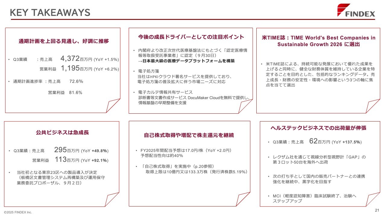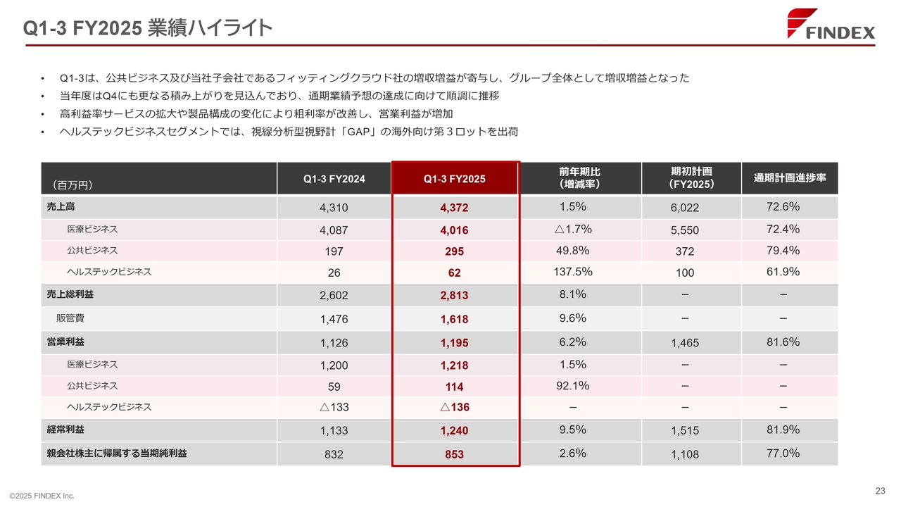 第3四半期累計では、公共ビジネスセグメントおよび子会社フィッティングクラウドの増収増益がグループ全体の増収増益に寄与しました。当年度は第4四半期にもさらなる積み上がりを見込んでおり、高利益率サービスの拡大や製品構成の変化による粗利率の改善を背景に、通期業績予想の達成に向けて順調に推移しています。