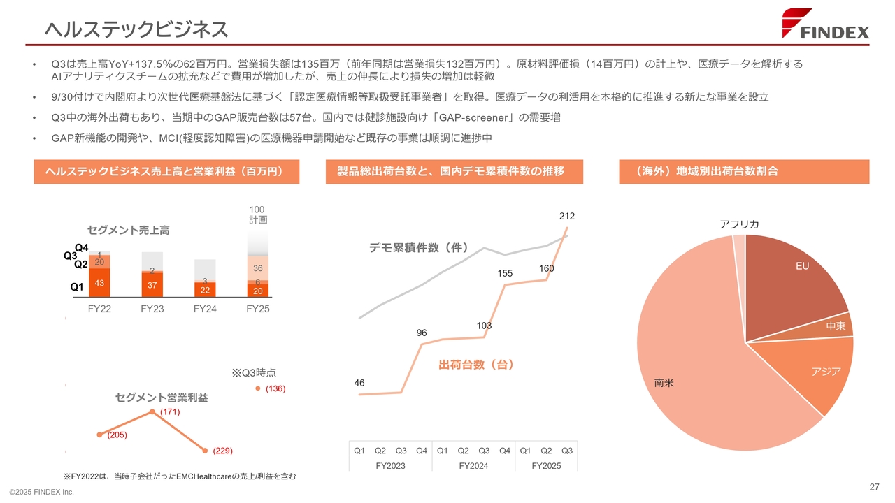 ヘルステックビジネスも着実に成長しています。第3四半期累計の売上高は前年同期比137.5パーセント増の6,200万円と拡大しました。レクザム社を通じて「GAP」の第3ロット50台を海外へ出荷したことが貢献しています。