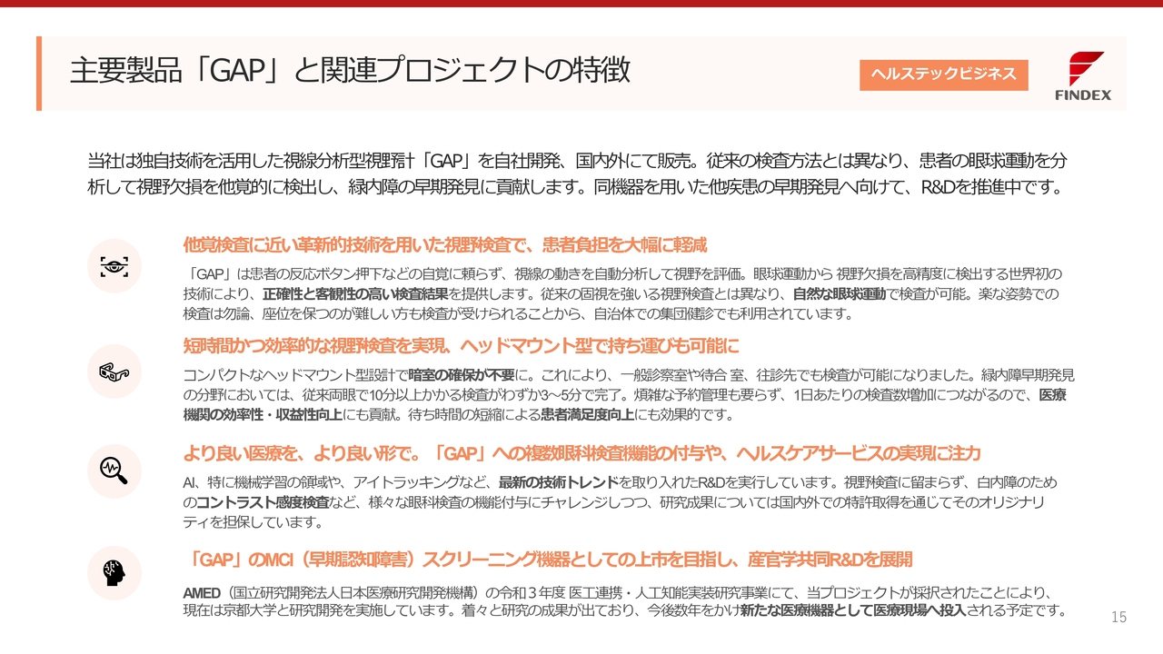 ヘルステックビジネスの取り組みとしては、次世代医療基盤法に則ったデータプラットフォーム事業の、医療ビジネスからの移管および体制整備、「GAP」の国内外代理店候補の追加・連携強化、海外販売地域の拡大、コントラスト感度検査機能の追加に向けた研究開発、MCI関連の研究開発など、多角的な活動を進めています。