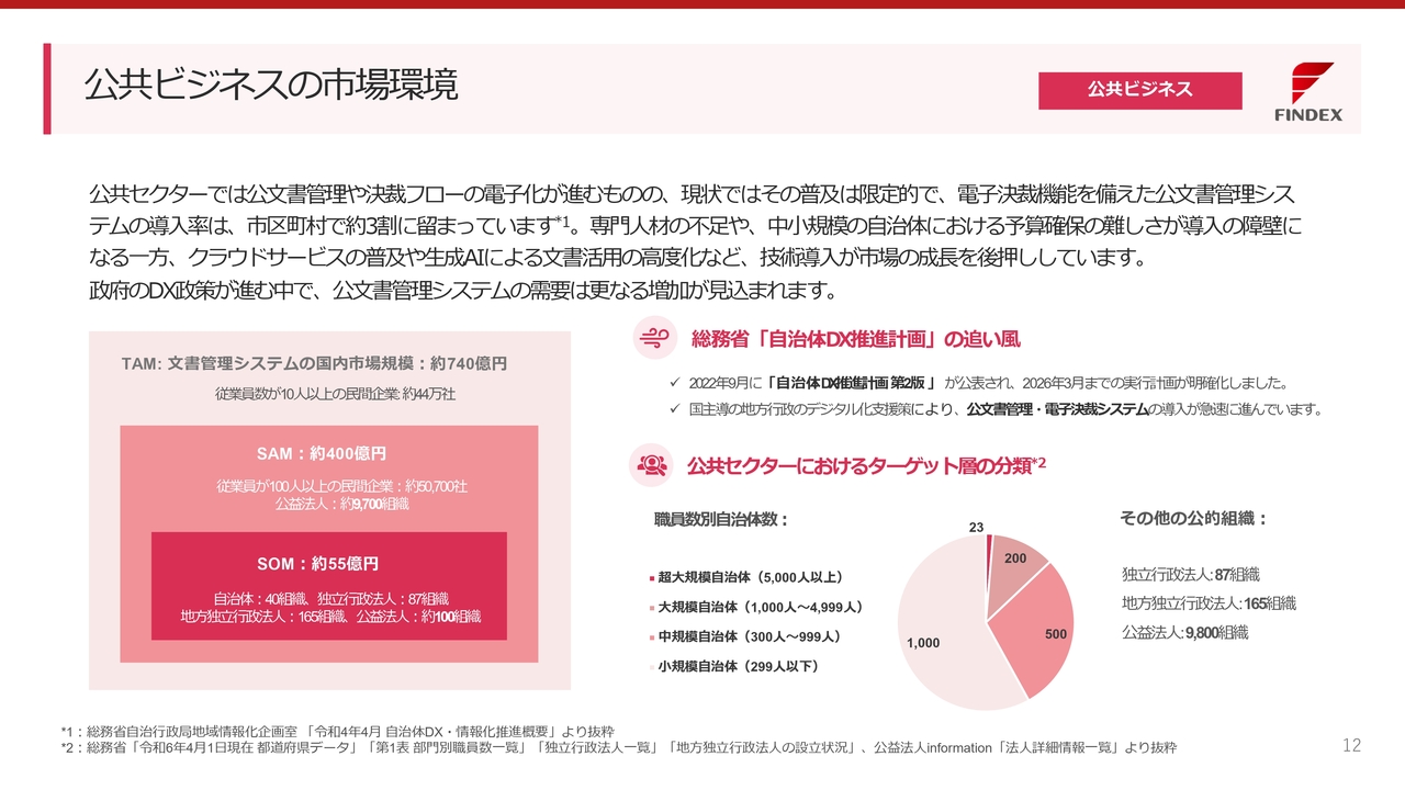 また、自治体向けの補助金制度や交付金制度に即した導入支援スキームの提案、クラウド型SaaSモデルを活用した初期導入負担の軽減、AIを活用した文書検索・要約・類似案件抽出といった機能強化を通じて、継続的かつ高付加価値なサービスとして差別化を図ります。これらを通じて、自治体DX市場において安定的な成長と高収益の実現を目指します。