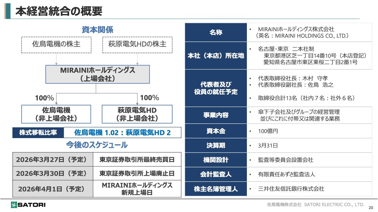 本経営統合の概要です。資本関係は、スライド左上に記載されているとおりです。当社および萩原電気ホールディングス株式会社は、2026年4月1日以降、株式移転により新たに上場する持株会社「MIRAINIホールディングス株式会社」の完全子会社となります。