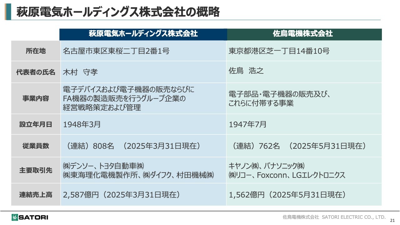 代表取締役社長には、現萩原電気ホールディングス代表取締役社長執行役員の木村守孝氏、代表取締役副社長には私、佐鳥浩之が就任予定です。設立時の資本金は100億円、決算期は3月末とする予定です。