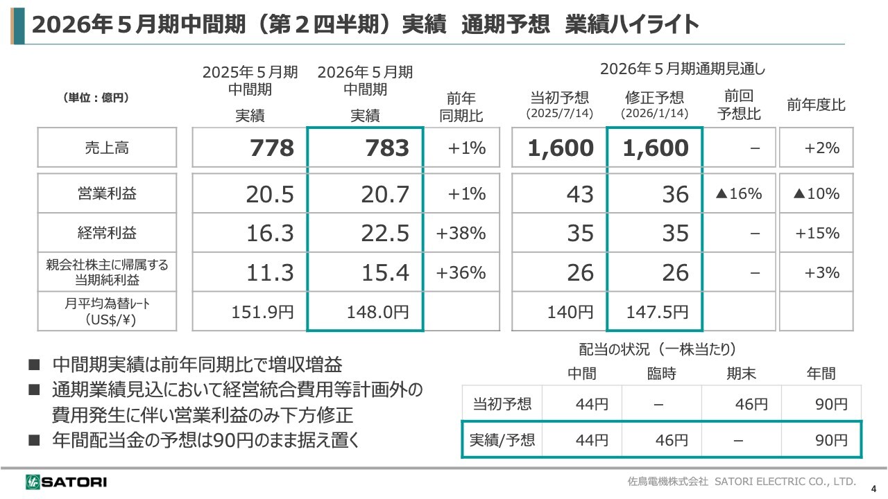 はじめに、2026年5月期中間期の実績および2026年5月期の通期予想についてご説明します。