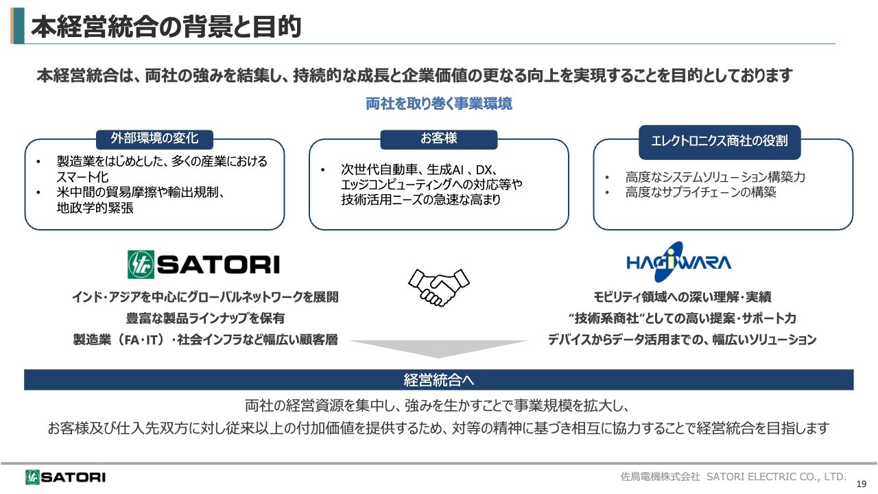 ここからは、昨年12月11日の臨時株主総会で決議された萩原電気ホールディングスとの経営統合についてご説明します。最初に、本経営統合の背景と目的についてです。