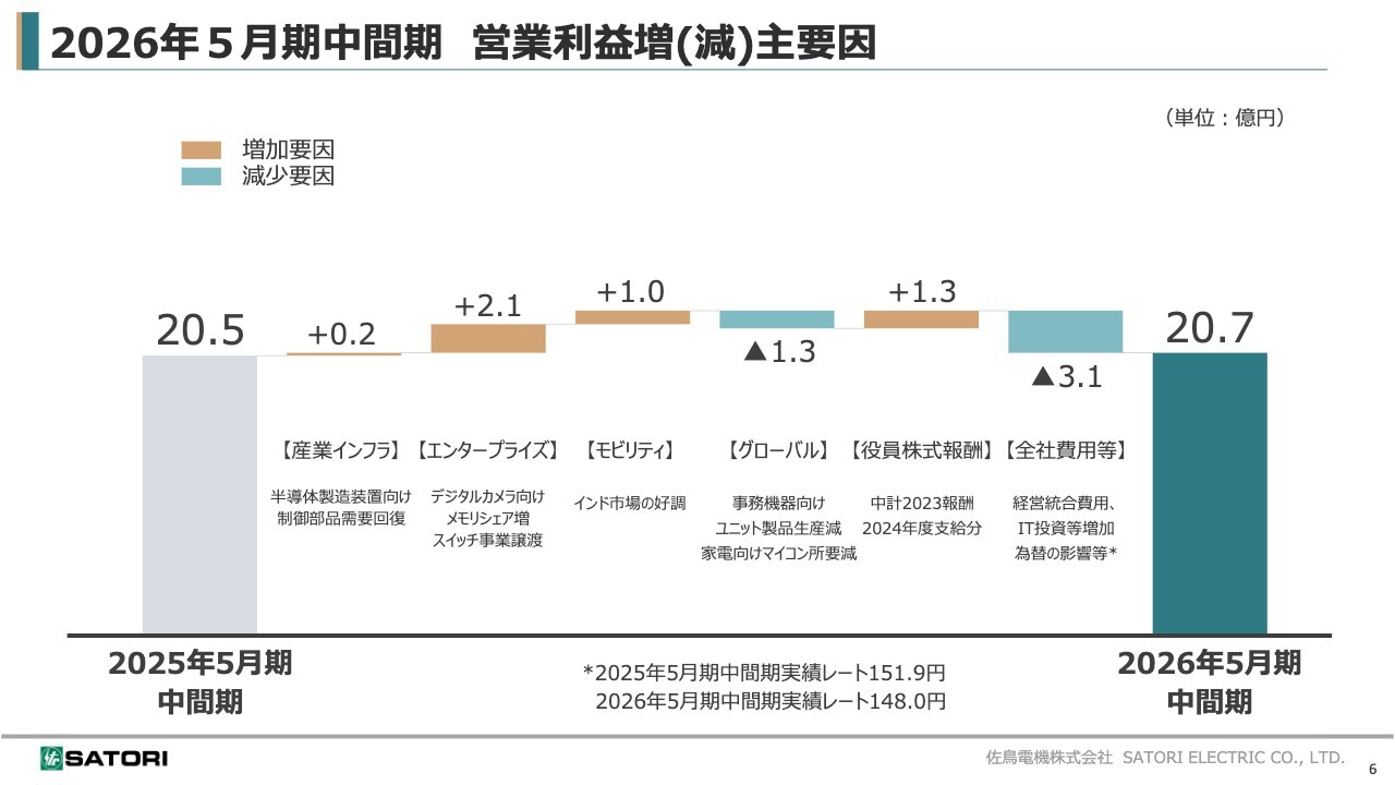 2026年5月期中間期の営業利益の増減要因についてです。