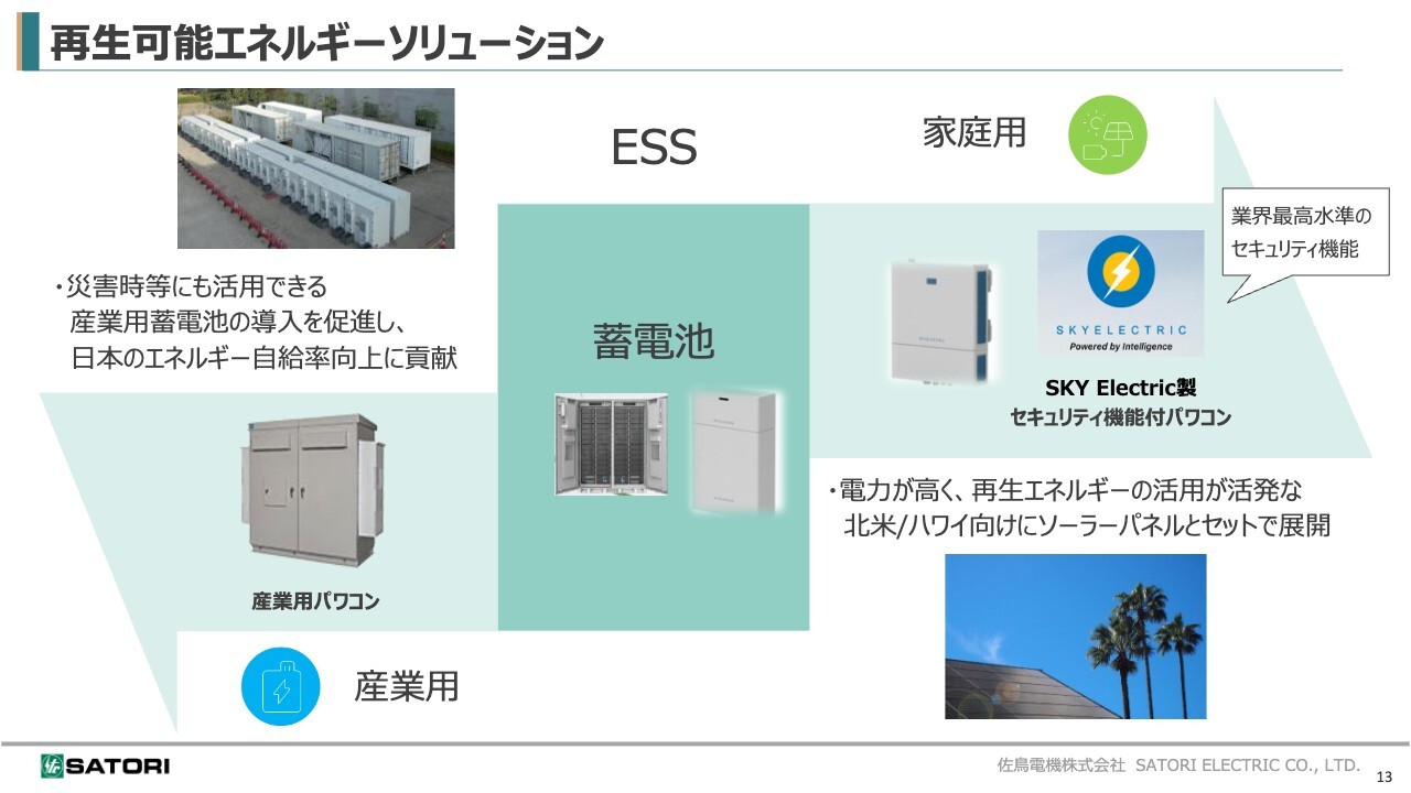 まず、産業用再生可能エネルギーソリューションでは、災害時などにも活用可能な産業用蓄電池を自治体向けに展開し、日本のエネルギー自給率の向上に貢献していきます。