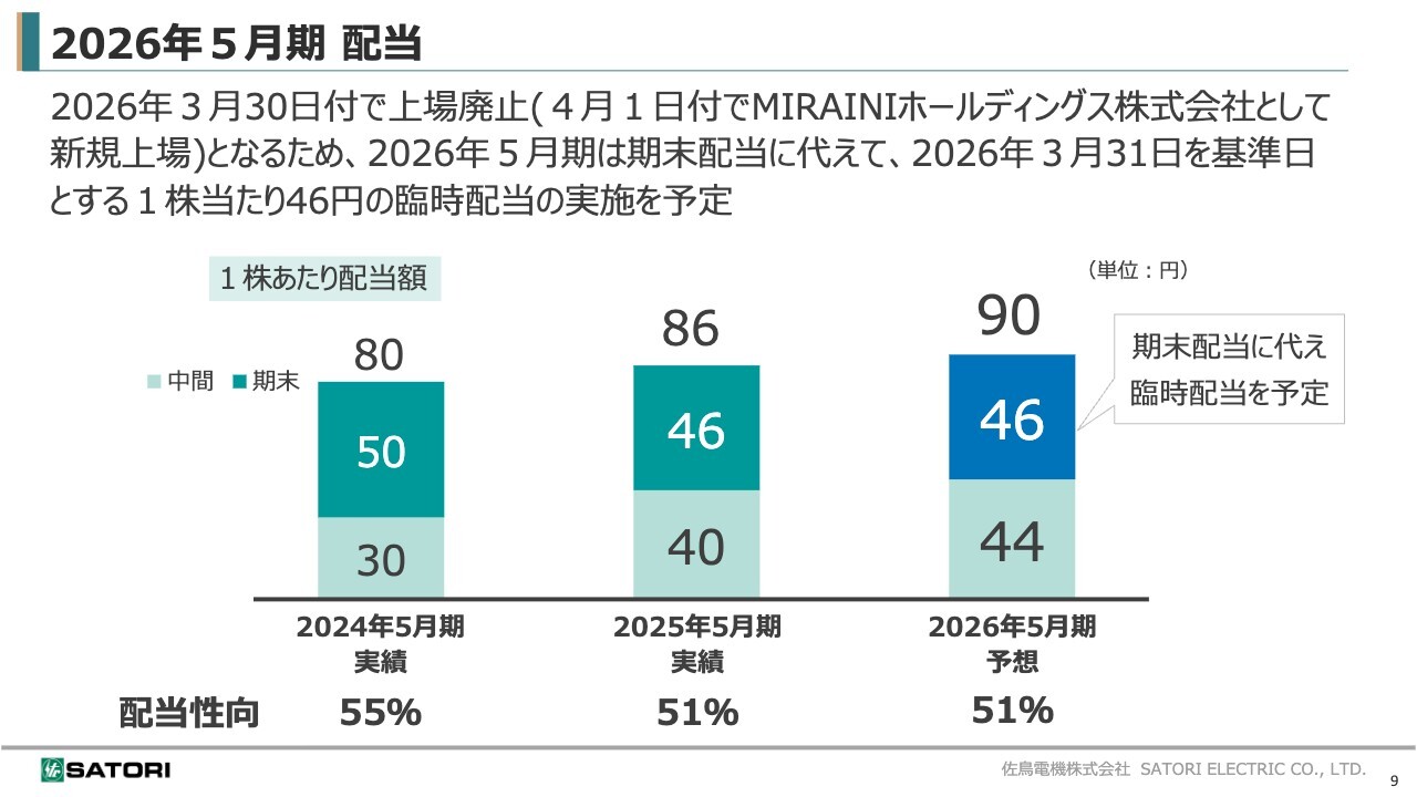 先ほどご説明しましたが、期末配当に代えて、2026年3月31日を基準日とする1株当たり46円の臨時配当を実施する予定です。年間では、当初の配当予想どおり1株当たり90円の配当を見込んでいます。