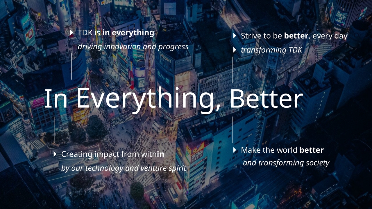 私たち「TDK United」のチームメンバーは10万人いますが、すべての中に入る「In Everything」で、常に「Better」を目指していきます。Transformを続けながらサステナブルな成長を実現していきたいと考えています。今後とも、ご指導、ご支援の程よろしくお願いします。ありがとうございました。